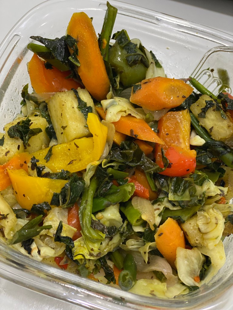 Prepping for lunch typically means having cooked vegetables in the fridge or a basic salad. Cooked vegetables could be with or without greens. Typical vegetables cooked for the week are a combo of cabbage, carrot, green beans, onions and garlic. If it’s a meat-free meal, mushrooms are a part of the mix. The vegetable mix lasts for 2 or 3 meals and then another batch is made, if needed.