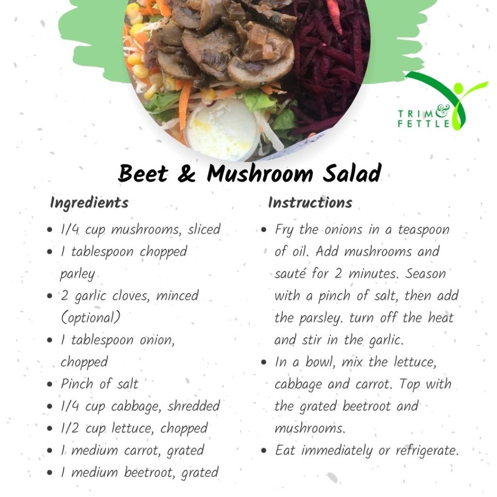 One of my favourite meatless meals is the beetroot & mushroom salad. Anyone who knows me knows that I love beets, they are packed with nutrients and a great source of fibre and iron. Salads are typically a go meal for me – the base is normally a mix of lettuce, carrot and cabbage. Today, I share the beet & mushroom salad recipe with you.